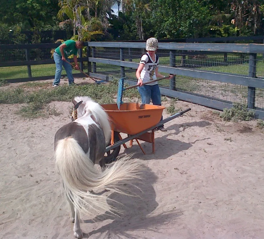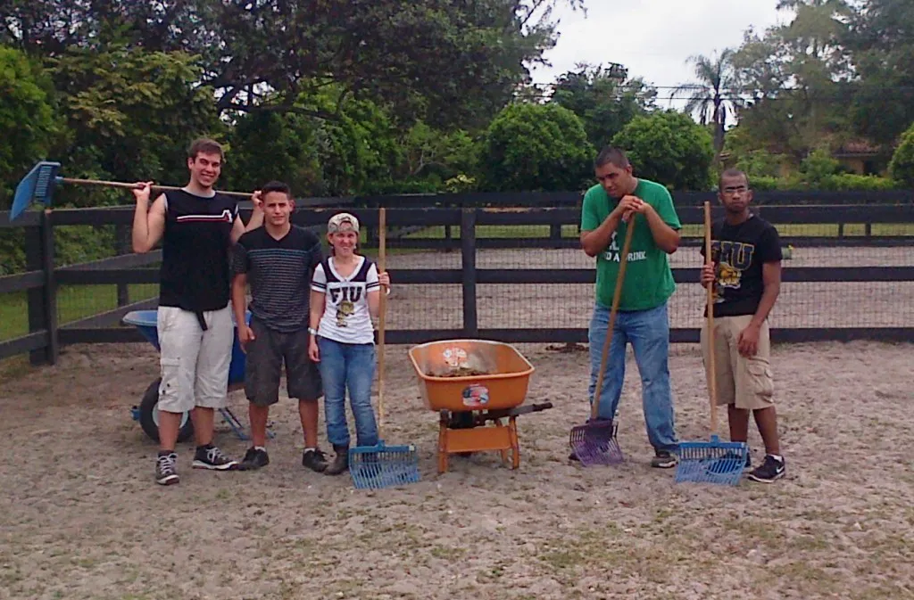 For several days in May and June 2013, students enrolled in FIU’s Project Panther Life program came out to the barn to do community service. They helped with all the morning chores, cleaning water and feed buckets and mucking out the paddocks. For many of them this was their first time working around and with horses. Everyone worked hard and had a truly one of a kind experience. After completing the chores they enjoyed a healthy lunch under our banyan trees.